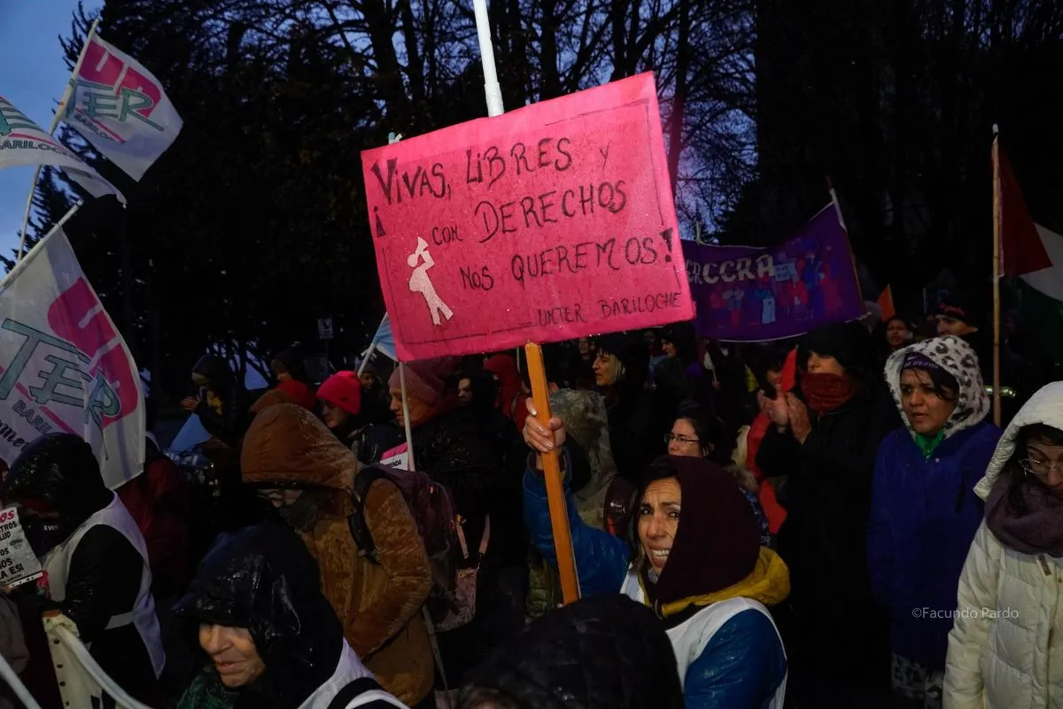 Alrededor de ciento cincuenta personas fueron las que arribaron a la plaza emblema de Bariloche. Algo más de una hora antes habían partido cerca de ochenta desde la intersección de Moreno y Onelli. El resto de sumó en el camino. Cabe resaltar que la manifestación –que correspondió al décimo aniversario de la primera marcha que se realizó bajo el lema Ni una menos–, cuando tomó la calle Beschtedt, en lugar de doblar por Mitre, siguió por esa arteria para colocarse frente a la Catedral, donde, entre otros cánticos, se escuchó “Iglesia y Estado, asuntos separados”. Luego, la columna siguió por Vicealmirante O’Connor hasta Palacios, para después sí tomar Mitre.