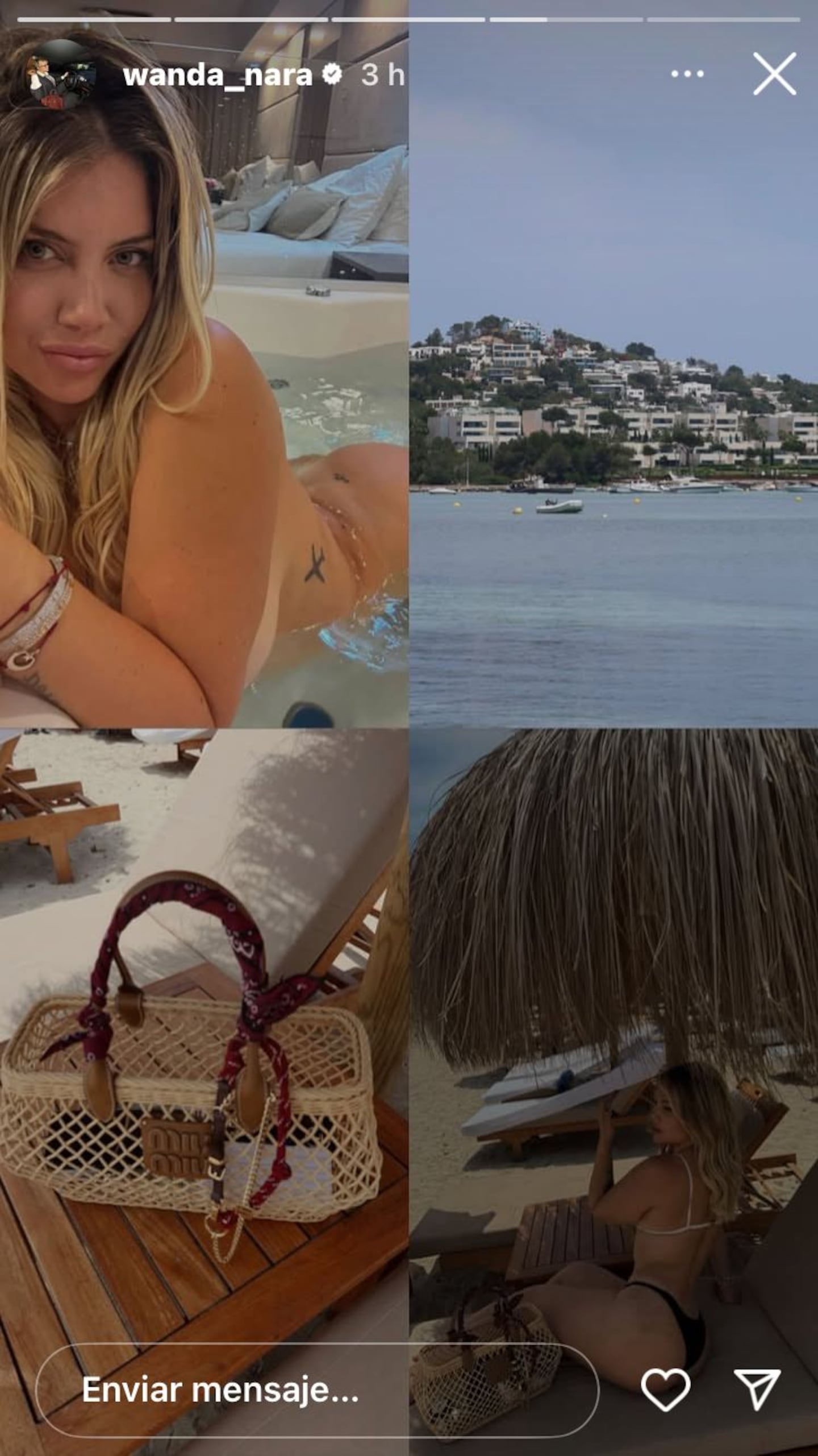 La storie consta de 4 foto en una. Por un lado el mar y la bella vista que tenía desde su lugar, mientras que abajo en diagonal colocó una imagen de su cartera y la reposera en la que se encontraba descansando.
