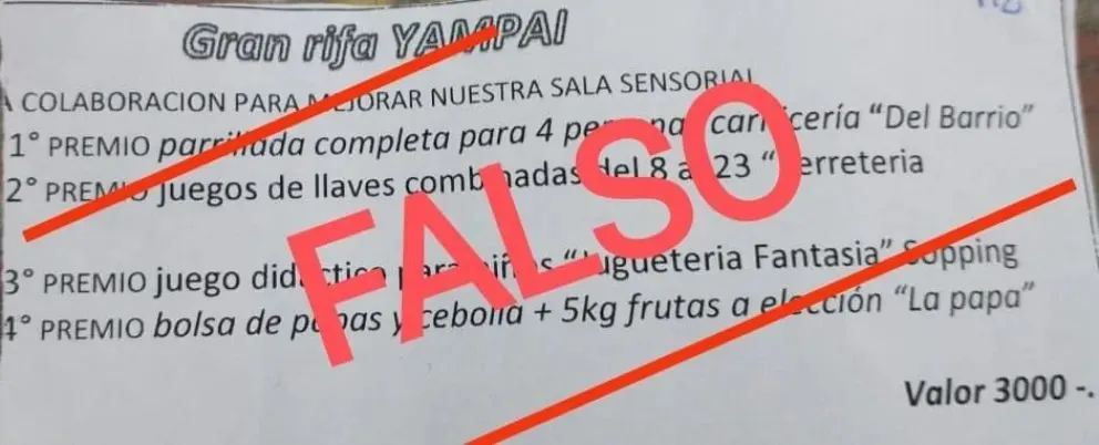 La rifa, según el talonario falso, la cobraron $3 mil pesos, bajo el nombre “Gran Rifa Yampai”, en la que anunciaron una parrillada, juegos didácticos,  un juego de llaves de una ferretería y una bolsa de papas, una de cebolla y 5kg de frutas.