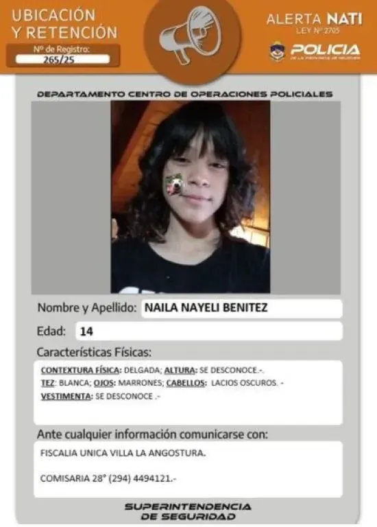 La Policía de Neuquén lanzó un parte oficial de búsqueda tras la desaparición de una menor de 14 años en la localidad de Villa La Angostura. La joven, que reside en el barrio Lomas del Correntoso. No se informó cuándo fue vista por última vez y su paradero continúa siendo desconocido.