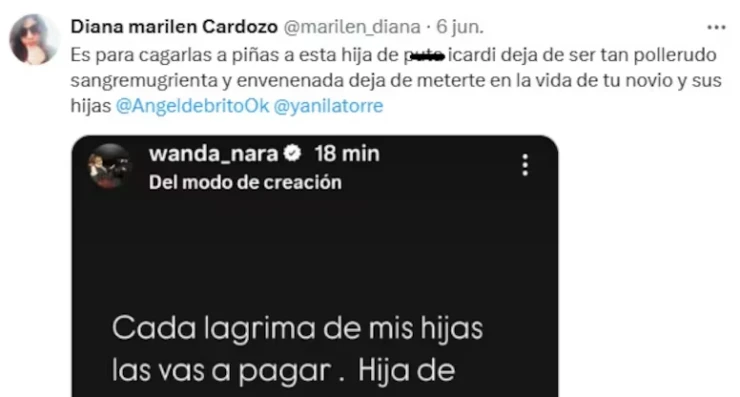 En sus historias, Wanda escribió: “Otra revinculación que esta zorra hija de pu… arruina”, y luego agregó: “Cada lágrima de mis hijas las vas a pagar. ¡Hija de p…! Después de dos meses logramos que el papá pueda ver a sus hijas, ¿y vas al colegio? Y hacés que mi hija más CHIQUITA no pueda merendar con su papá. ¡¡¡Mala persona!!!”.