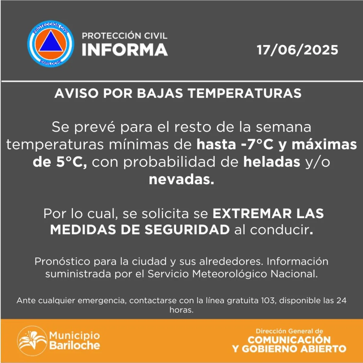 Con mínimas de hasta -7°C en sectores altos, se pide transitar con precaución y respetar las indicaciones.