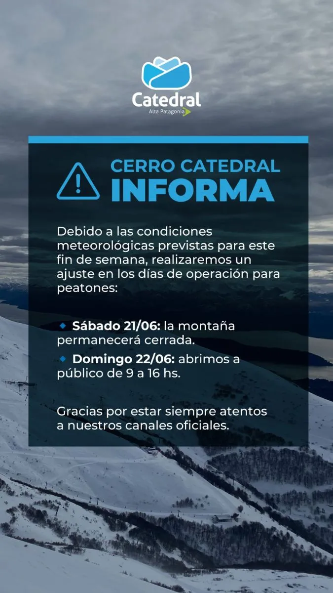 Debido a las condiciones meteorológicas previstas para este fin de semana, Catedral Alta Patagonia está realizando un ajuste en los días de operación para peatones: