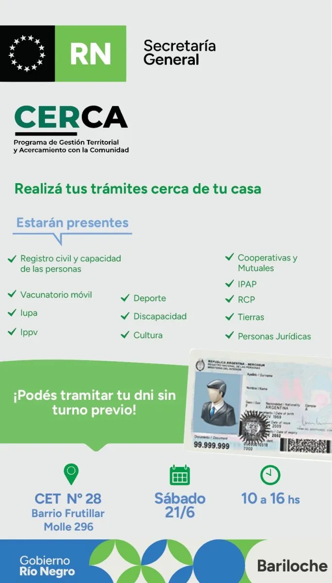 El Programa CERCA, una iniciativa del Gobierno de Río Negro que busca acercar los organismos del Estado a la ciudadanía, estará presente en el CET Nº 28, ubicado en la calle Molle Nª 296 del barrio Frutillar de San Carlos de Bariloche.