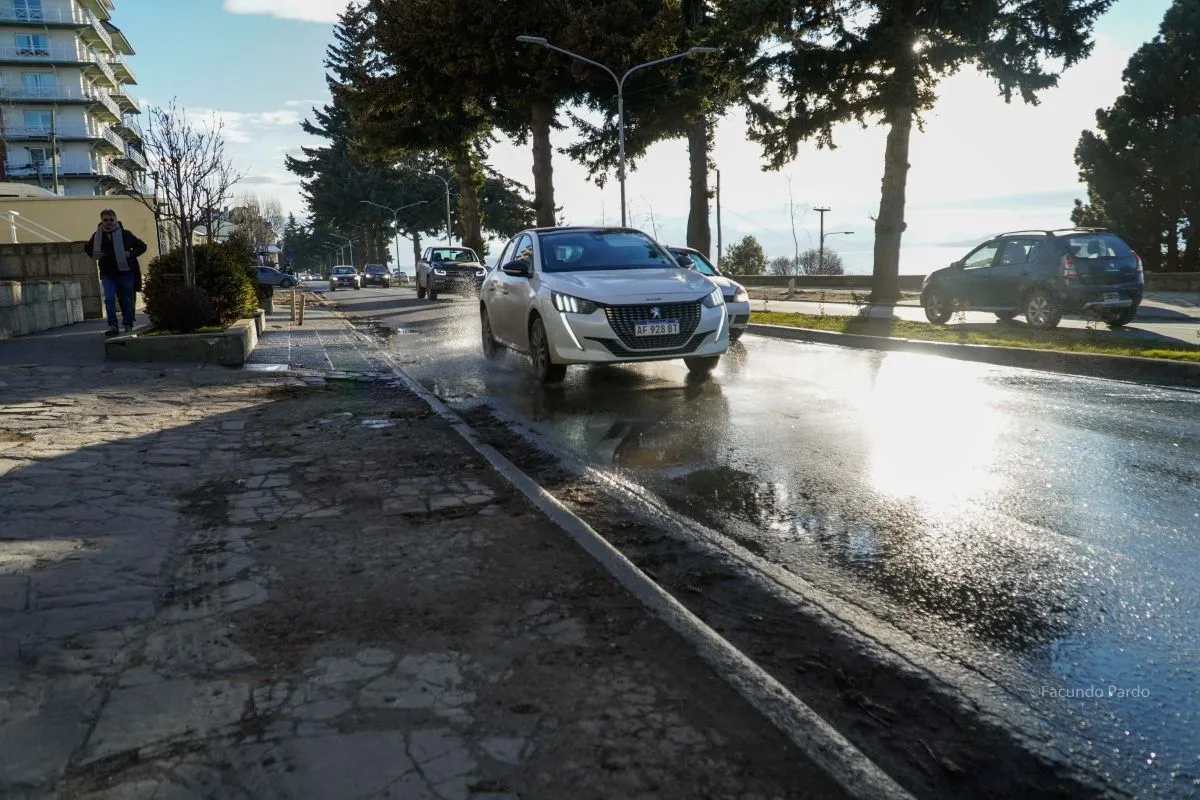 Una pérdida de agua en la costanera genera complicaciones para transitar por la Avenida 12 de Octubre. Con las bajas temperaturas, hay hielo en la zona lo que resulta peligroso para los transeúntes y conductores.