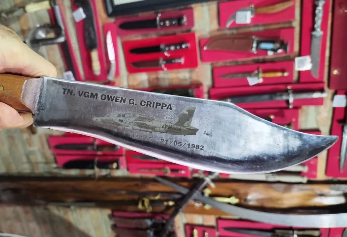 Cuchillo que el veterano de guerra Edgardo Suárez -quien reside en Bariloche- forjó para ser rifado y así recaudar fondos para ayudar a construir el museo que Owen Crippa desea levantar en Sunchales (foto gentileza).