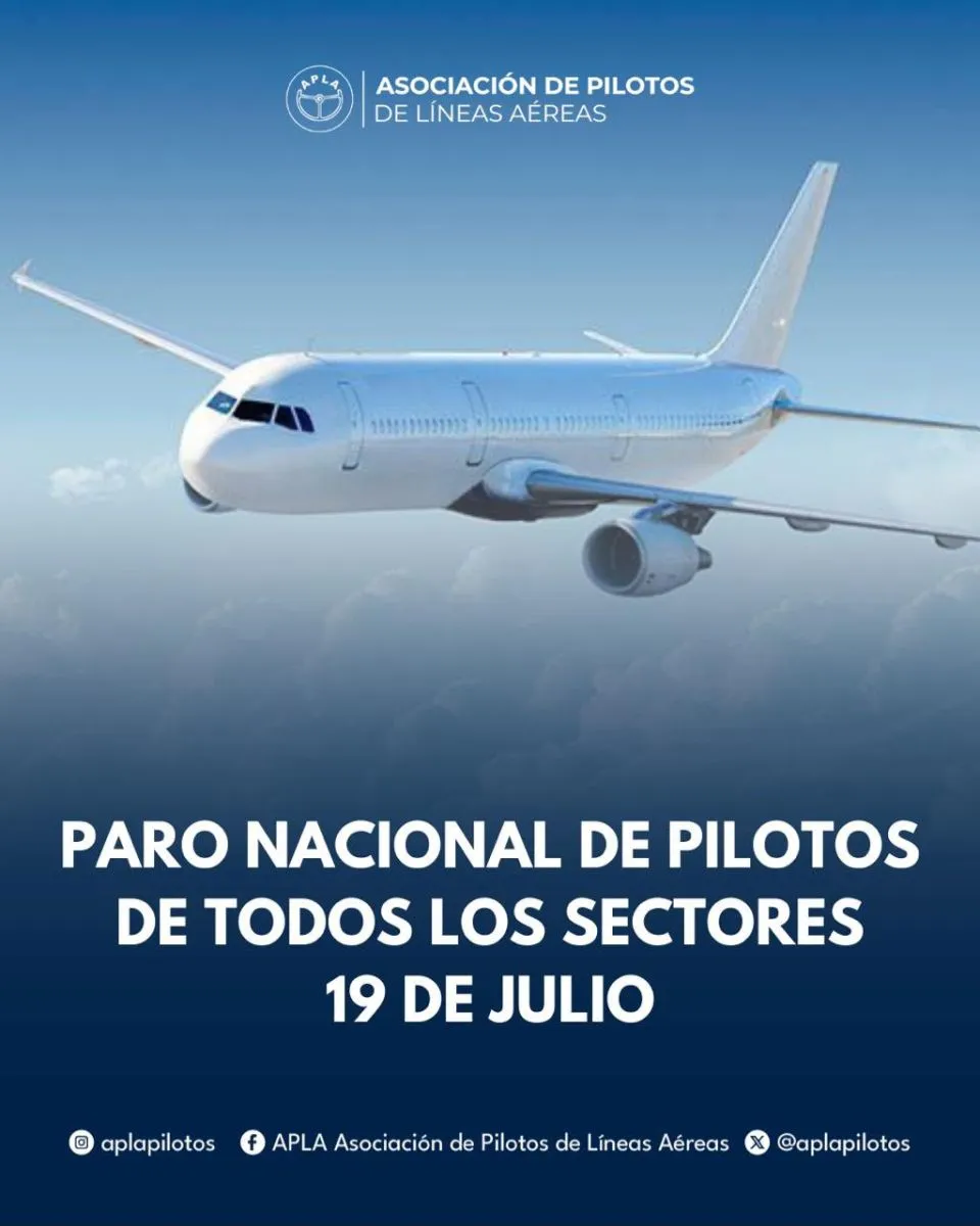 Este jueves al mediodía se conoció que La Asociación de Pilotos de Líneas Aéreas (APLA) anunció un paro nacional durante 24 horas en una fecha clave. Lo que afectará la partida y arribo de vuelos en todo el país.