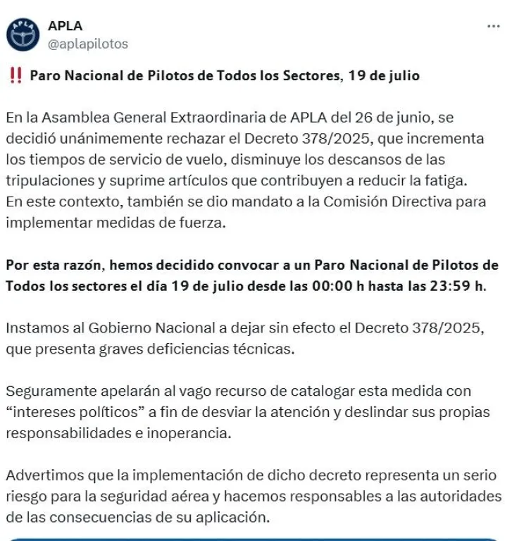 Y afirmaron que se tomó la decisión del paro ante el recorte de las horas de descanso de los pilotos dispuesto en el decreto 378. ”La implementación de dicho decreto representa un serio riesgo para la seguridad aérea y hacemos responsables a las autoridades de las consecuencias de su aplicación“, advirtieron en un comunicado.