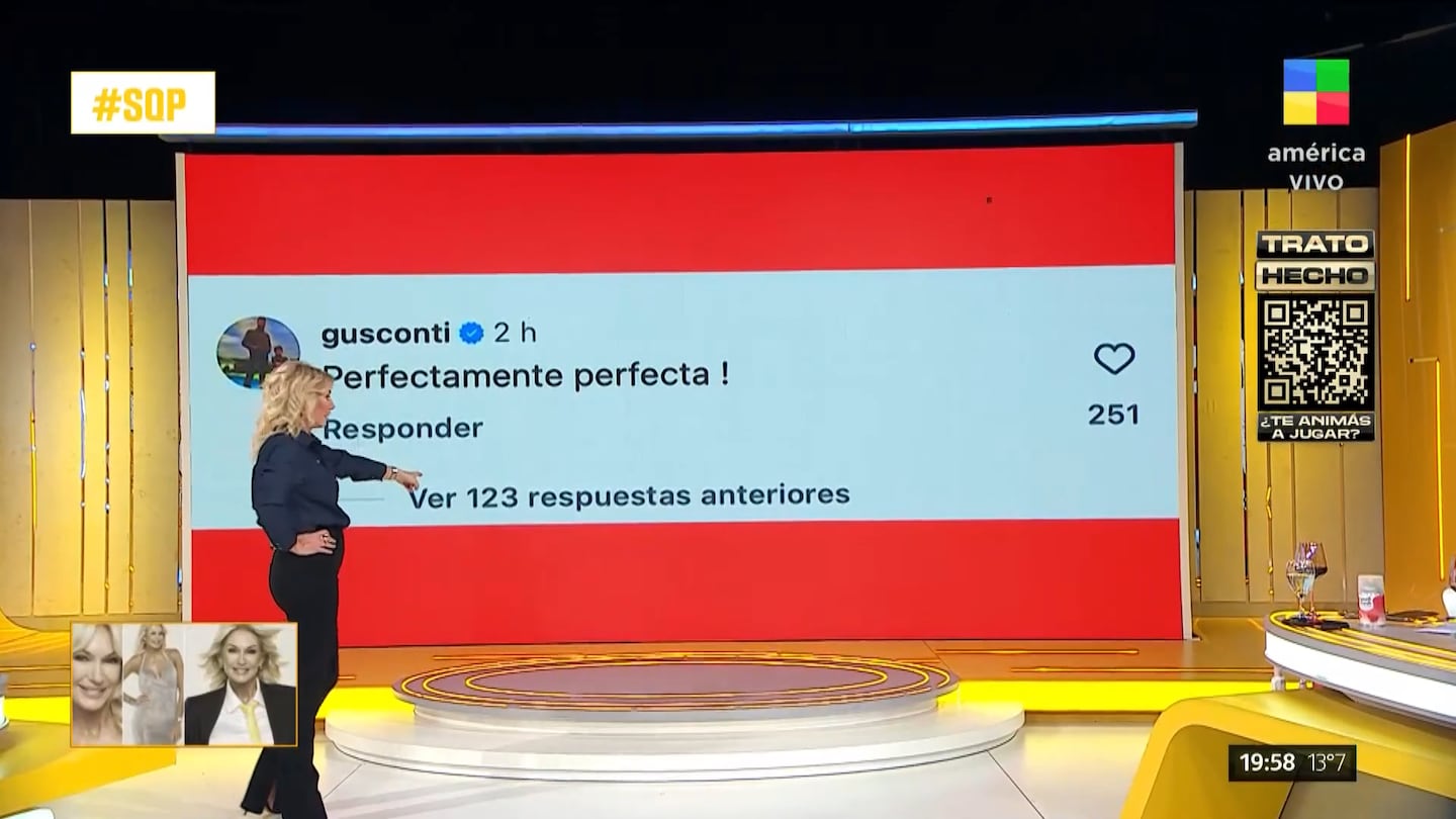 Al mostrar la foto de la China Suárez, la Negra expresó: “Divina, hermosa”. Pero la conductora se centró en la pelea y leyó el comentario de su marido: “Gustavo le puso: Perfectamente, perfecta”. Lejos de enojarse, ella coincidió: “Tiene razón”.