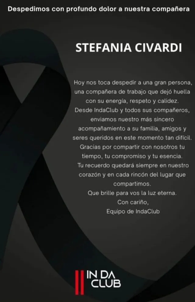 “Hoy nos toca despedir a una gran persona, una compañera de trabajo que dejó huella con su energía, respeto y calidez. Desde InDaClub y todos sus compañeros, enviamos nuestro más sincero acompañamiento a su familia, amigos y seres queridos en este momento tan difícil.