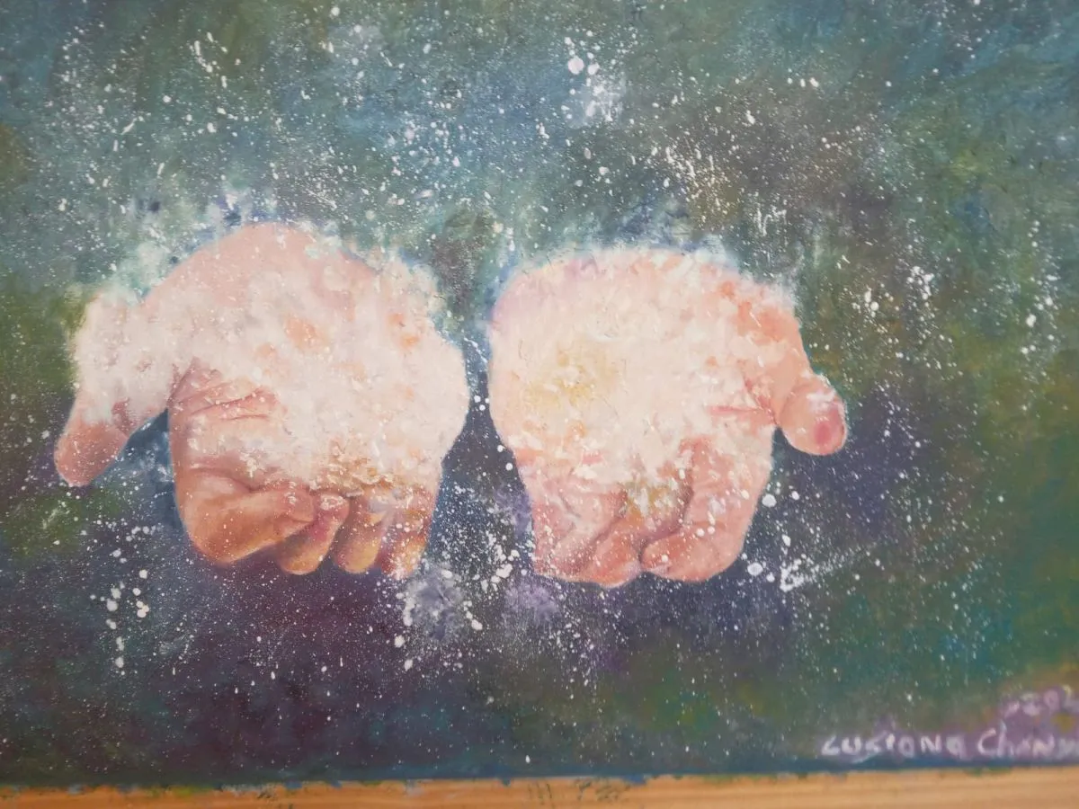 “En general, todo lo que pinto lo ‘veo’ antes. Se me presenta en la mente, incluso a través de sueños”, señala, y cuenta que una de las obras, donde se observan unos pies descalzos caminando, se “dibujó” en su cabeza junto a una frase que finalmente también incluyó en el cuadro: “Vive como si caminaras descalza. Lento, suave, con conciencia, con firmeza”.
