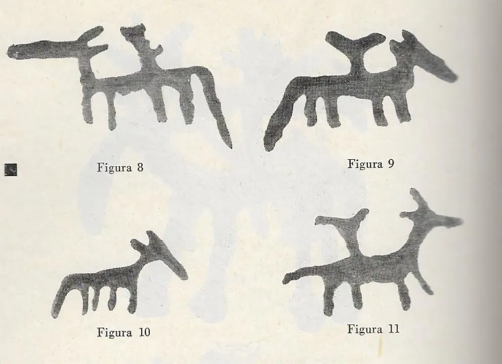 De forma ostensible, se trata de jinetes. A pesar de la aparente rusticidad que caracteriza a las pinturas rupestres, varias de las que se encontraron en isla Victoria representan a figuras humanas que están sobre un animal. Hasta fechas muy recientes los antiguos artistas despistaron a los investigadores, porque la documentación que refiere a la primera expedición española que llegó al Nahuel Huapi habla de 1620. No obstante, las expresiones de arte rupestre serían bastante más añejas. ¿Qué montaban aquellos hombres?.