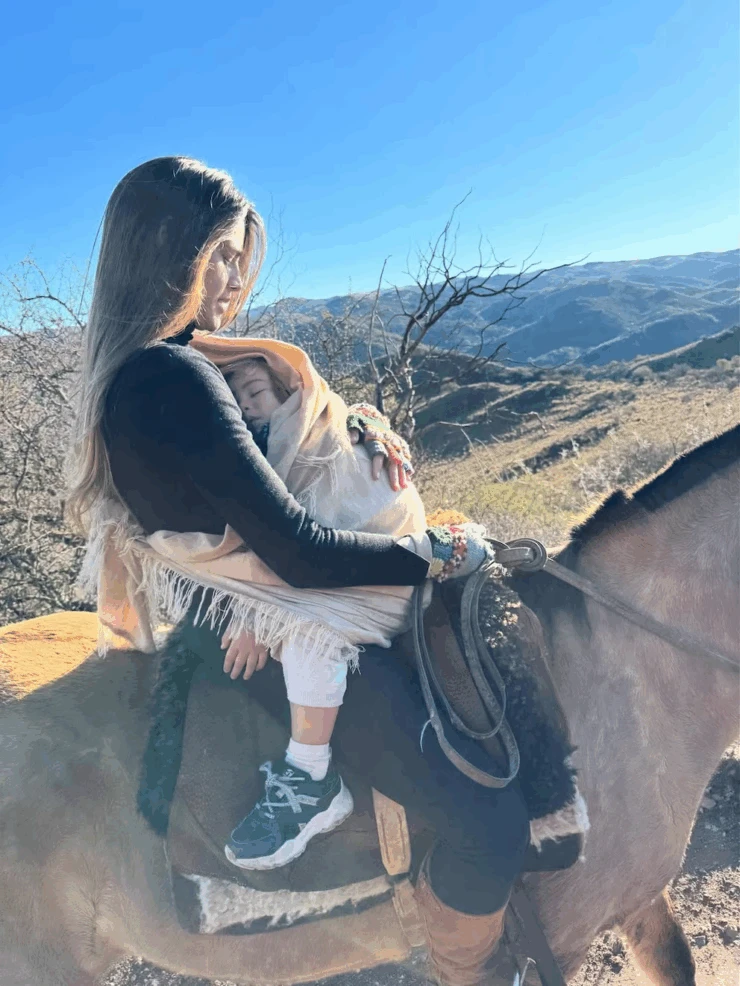 Durante su estadía, Calu Rivero compartió en redes sociales una serie de postales que capturan la esencia del descanso: paisajes de pastizales abiertos, cabalgatas entre caminos de tierra, perros jugando alrededor de la casa y el ritmo pausado que sólo la naturaleza puede ofrecer. “Vacaciones campo adentro”, escribió, sintetizando la experiencia.Las imágenes la muestran relajada, sonriendo entre senderos, abrigada para el frío invernal y montando a caballo junto a su familia. En una de las postales más tiernas, se la ve llevando a Bee entre mantas, disfrutando del aire puro y el calor del abrazo materno en pleno paseo matutino.