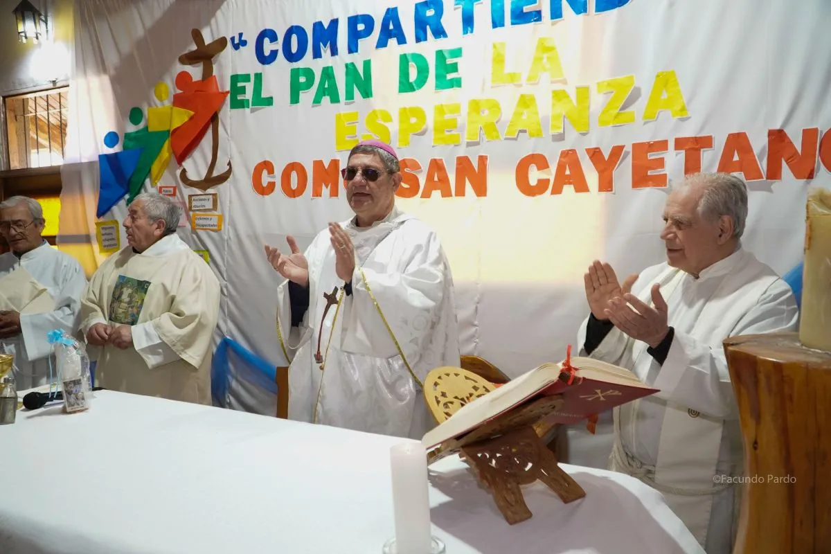 Por su parte, durante la misa de la tarde, el obispo Juan Carlos Ares recordó que en 1989 había sido diácono en el santuario de San Cayetano de Liniers, y leyó el mensaje que, por la celebración del santo, emitió la comisión ejecutiva de la Conferencia Episcopal Argentina. Así, expuso: “Este día nos invita a escuchar el clamor de tantos hermanos y hermanas que ven en el trabajo la posibilidad de ser útiles y de contribuir al bien común. Trabajar constituye un derecho fundamental que construye la vida propia y la del grupo familiar, y sostiene el tejido social. La falta de trabajo hiere profundamente la dignidad de las personas y puede conducir al desaliento, al aislamiento y a la pérdida de sentido”.