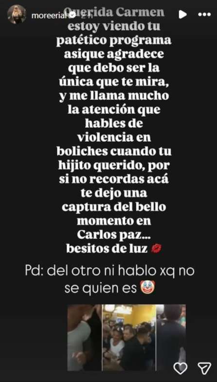 En uno de sus mensajes, la joven apuntó directamente a la conductora: “Querida Carmen, estoy viendo tu patético programa, debo ser la única que te mira. Me llama la atención que hables de violencia cuando tu hijo querido en Carlos Paz... si no recordás, te dejo una captura del bello momento”. Con esto, dejó entrever un reproche hacia un episodio vinculado a Fede Bal, escalando el conflicto.