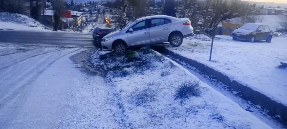 Despistes y autos cruzados por presencia de hielo en calles de Bariloche (foto: móvil El Cordillerano Radio)