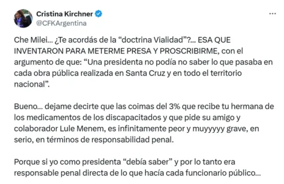 Cristina Kirchner publicó un fuerte posteo contra Javier Milei, relacionado con los audios del amigo y abogado del presidente, Diego Spagnuolo.