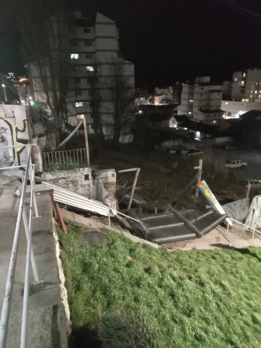 Durante el domingo, un fuerte temporal de viento provocó serios daños en una estructura perimetral de chapas perteneciente a una obra privada ubicada en la esquina de Frey y Moreno. El cerco, que delimitaba el terreno con la escalera, colapsó y parte de las chapas volaron, generando una situación de  riesgo para los transeúntes.
