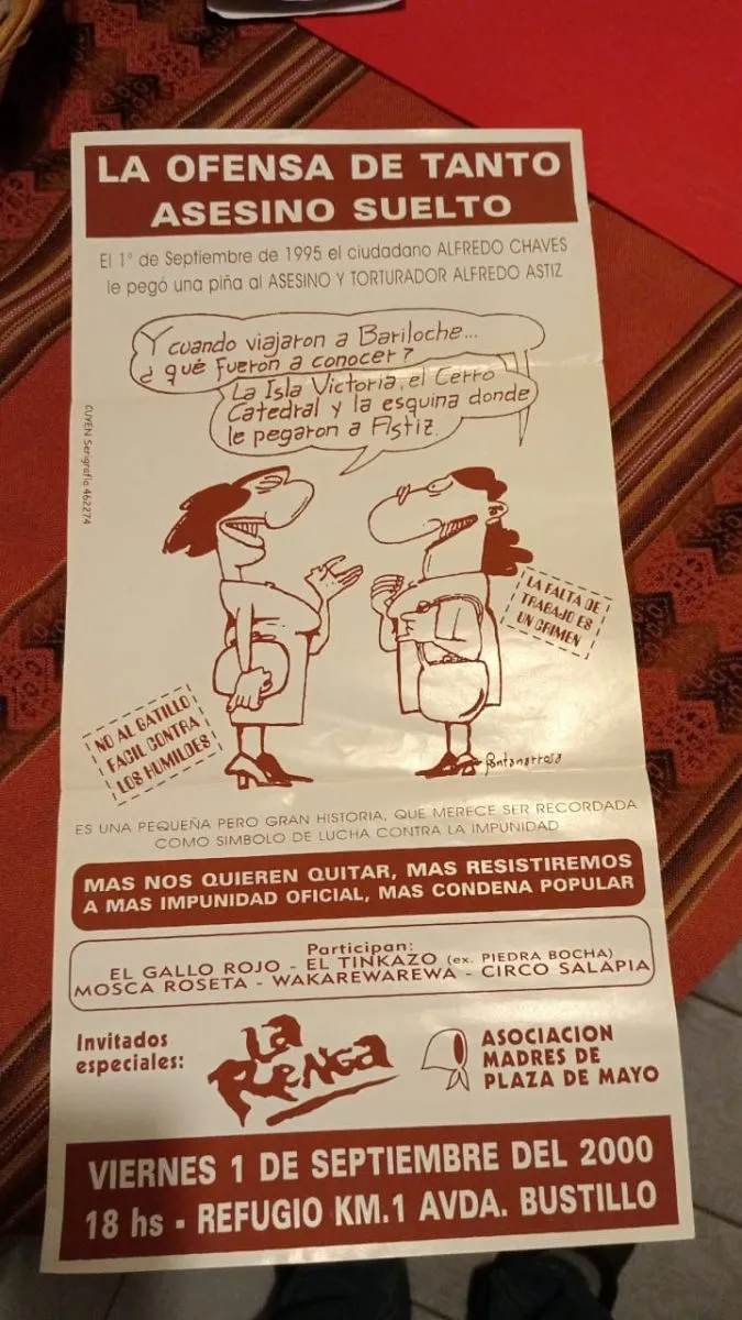 Para celebrar el décimo aniversario de “La piña de la dignidad” estuvo nada menos que La Renga, que también supo hacerse presente en otras ocasiones. Después, por la desafortunada coincidencia en la fecha con la tragedia del cerro Ventana, no hubo ánimos de festejar, pero el próximo 1ro de septiembre será a todas luces especial: 30 años atrás Alfredo Chaves advirtió la presencia de Alfredo Astiz en un parada de colectivos y después de superar la incredulidad y ante la respuesta afirmativa, el rostro del represor recibió una vindicadora trompada. Transcurría 1995 y si la memoria del que escribe no falla, era miércoles.