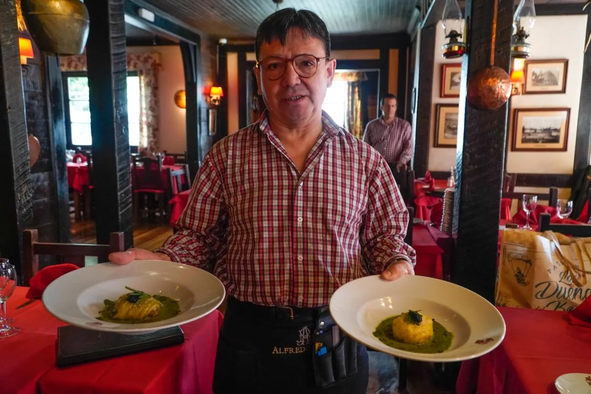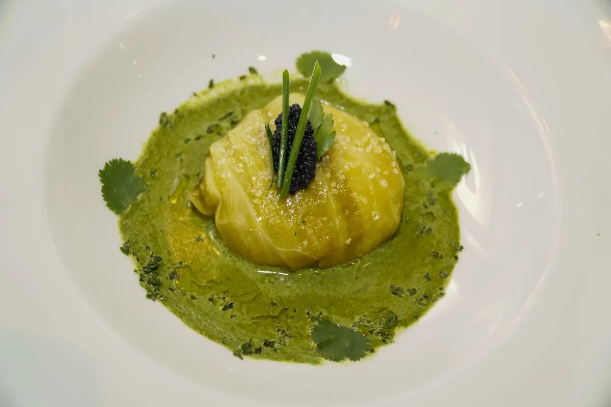 Jorge trae la entrada y comenta que se trata de trucha fresca combinada con ahumada, en un envoltorio de col macerado, más una salsa de langostinos y espinacas, con un toque de caviar.