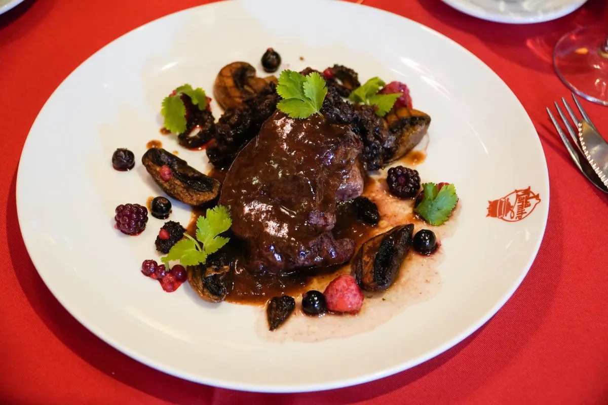 De tal forma, el chef ideó una preparación especial para esta experiencia. Escogió ofrecer un lomo de ciervo marinado en pinot noir y hierbas (romero, tomillo y perejil, más un diente de ajo aplastado y pimienta negra en grano), duxelle de setas, boletus y morillas, reducción de pinot noir y frutos rojos.