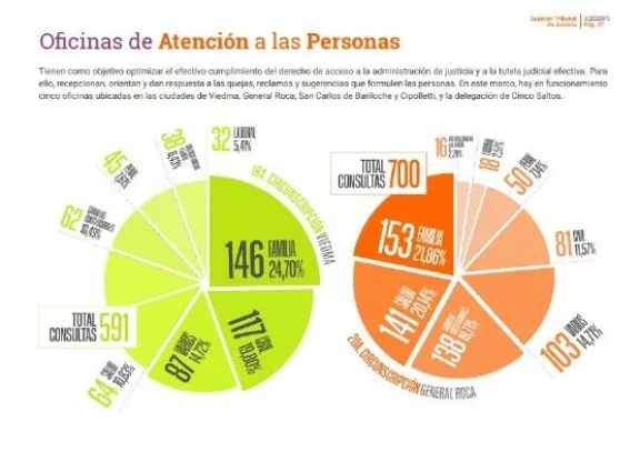 La oficina de Viedma atendió 591 consultas, la de Roca 700, la de Bariloche 593 y la circunscripción que reúne Cipolletti y Cinco Saltos concentró 499. Estos números evidencian la importancia de los espacios de atención primaria que reciben de manera directa las inquietudes de la ciudadanía. La Corte Suprema mide periodicamente estos mecanismos de acceso a Justicia y mantiene a Río Negro entre los primeros puestos de ese monitoreo.