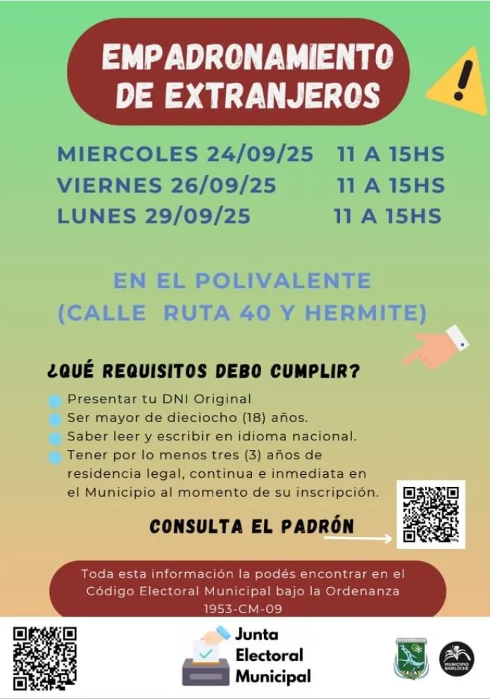 La Junta Electoral Municipal de San Carlos de Bariloche informa a la comunidad extranjera que se llevará adelante el empadronamiento de extranjeros, en el marco de lo establecido por el Código Electoral Municipal (Ordenanza 1953-CM-09).