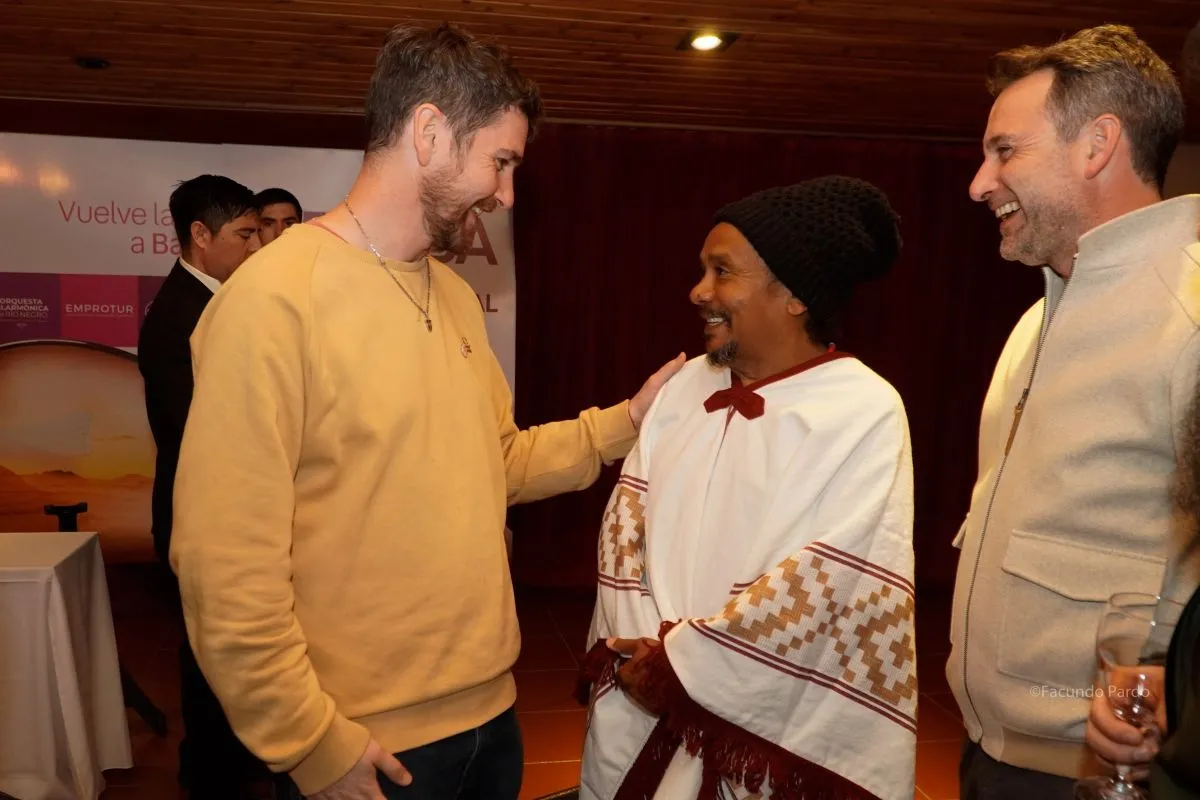 El subsecretario de Cultura de Bariloche, Martín Iriarte, y el director artístico del festival, Martín Fraile Milstein, junto al músico brasileño.