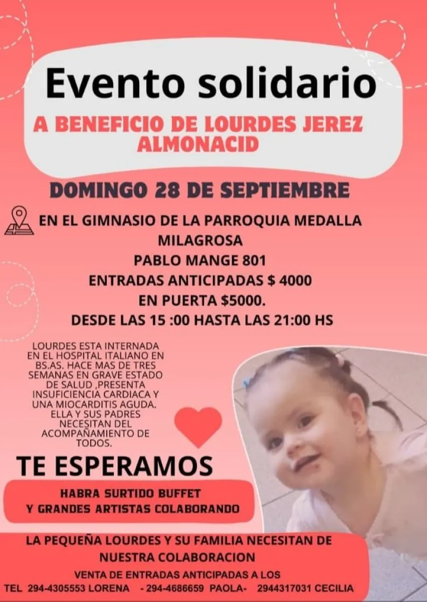 Vecinos, amigos y miembros de la parroquia Medalla Milagrosa unieron fuerzas para organizar un evento solidario en apoyo a Lourdes Jerez Almonacid, una niña de un año que permanece internada en Buenos Aires. La propuesta busca aliviar los gastos de su familia y hacerles sentir el respaldo de toda la ciudad.
