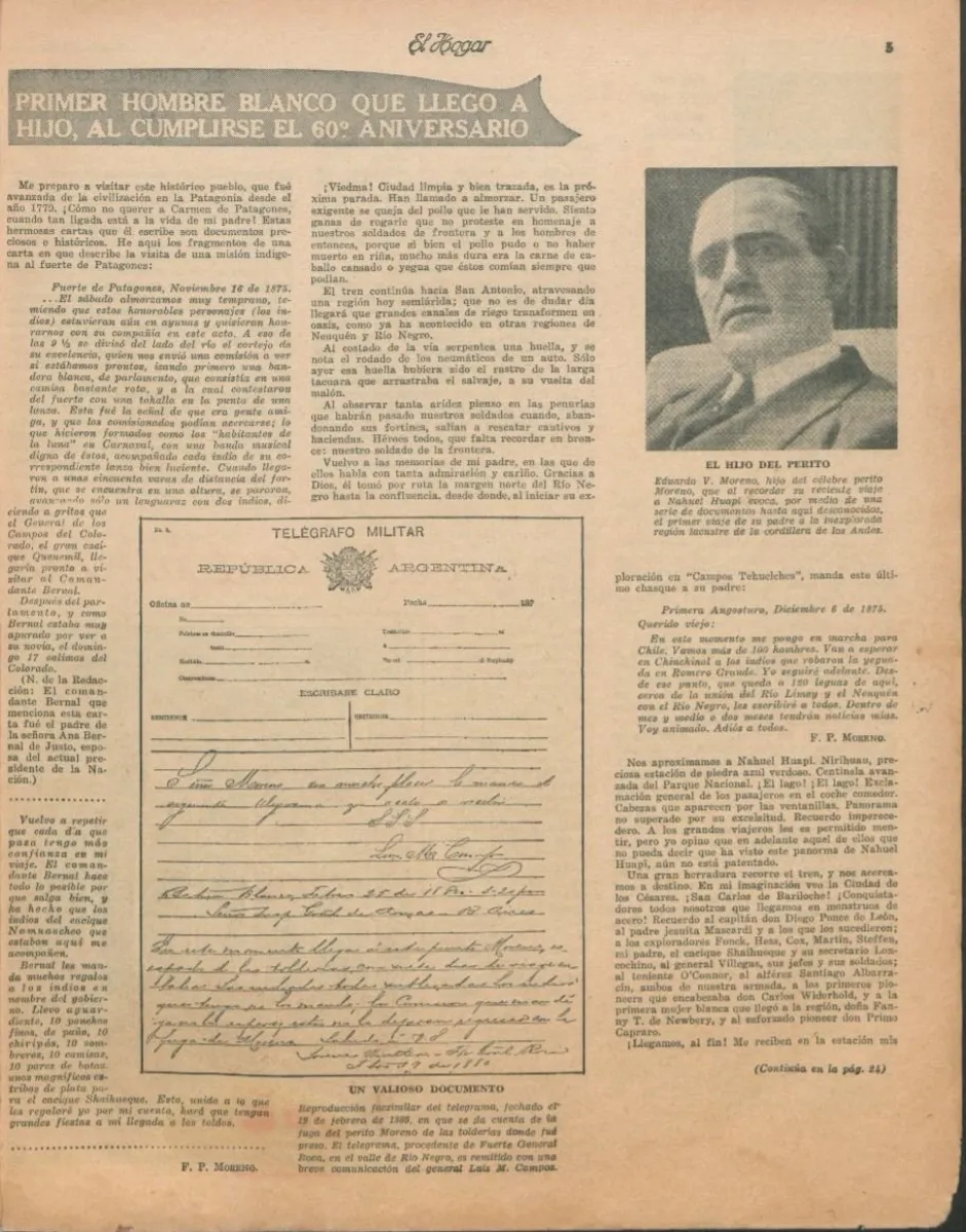 El 27 de septiembre de 1875 le escribió Francisco Pascasio Moreno a su mayor: “Querido viejo. Perfectamente bien llegué anoche a este pueblo para continuar viaje hoy a Bahía Blanca; pero los rumores de invasión de los indios que hemos escuchado por aquí han hecho que el mayoral suspenda el viaje hasta mañana temprano, lo que me viene muy bien, pues me permite escribirte”, arranca la misiva. Su hijo Eduardo la reprodujo el 7 de febrero de 1936 en el periódico “El Hogar”, a cuya versión en PDF accedió El Cordillerano.