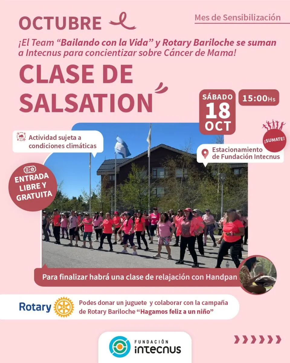Durante todo octubre se celebra el mes de la concientización del cáncer de mama y el sábado 18 a las 15 horas, en el estacionamiento de Intecnus, el Rotary Club Bariloche se integrará a la agenda del centro de medicina nuclear para el Día Mundial de la Prevención del Cáncer de Mama, con una clase de Salsation (baile) para toda la familia.