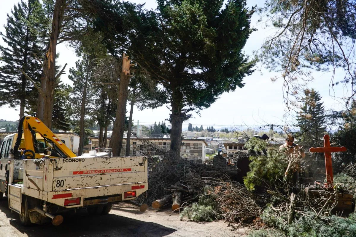 Las fuertes ráfagas de viento provocaron la caída de un pino en el predio del Cementerio Municipal Bariloche, en Onelli y Hermite, en el Alto de la ciudad. Durante la jornada se registran vientos intensos con ráfagas que superan los 90 km/h.