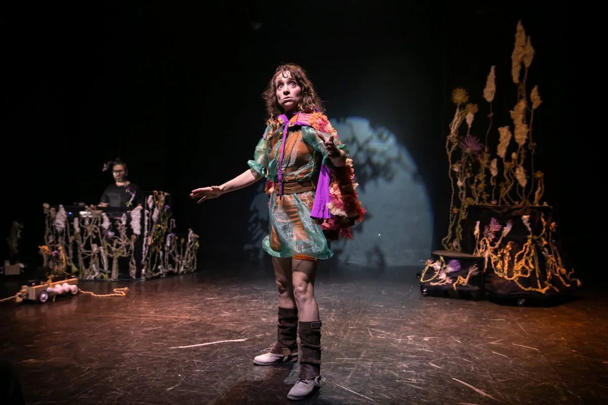 En su desarrollo “desarma y exhibe mecanismos teatrales, llevando al espectador a presenciar no sólo una función, sino el proceso mismo de construcción escénica. En un espacio que se presenta sin ocultamientos —luces, cables, estructuras visibles— la actriz se encuentra con el público desde la vulnerabilidad, el humor, lo absurdo y el drama. A lo largo de la obra, los colores rojos van tiñendo la escena, acompañando el relato íntimo y performativo de la actriz”. “Frutos rojos” se originó en una creación colectiva, tiene dirección de Cristian de Campos Morais y actúa Virginia Bernasconi, los dos integrantes de ConMarcaAndina (sic) Teatro y Actitud Pandora.