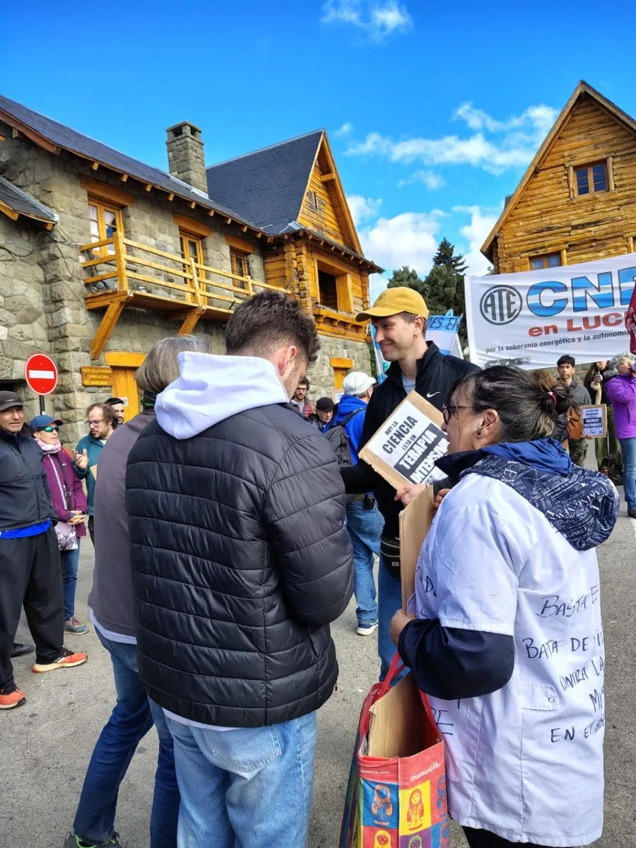 "Hoy nos concentramos en la entrada de la carpa de Bariloche a la Carta y la idea es poder concientizar a cada persona, a través de la entrega de un volante, para que sepan lo que está pasando en la CONEA, en el Centro Atómico, en Parques Nacionales, a los jubilados a nivel país y lo que sucede en nuestros establecimientos también".