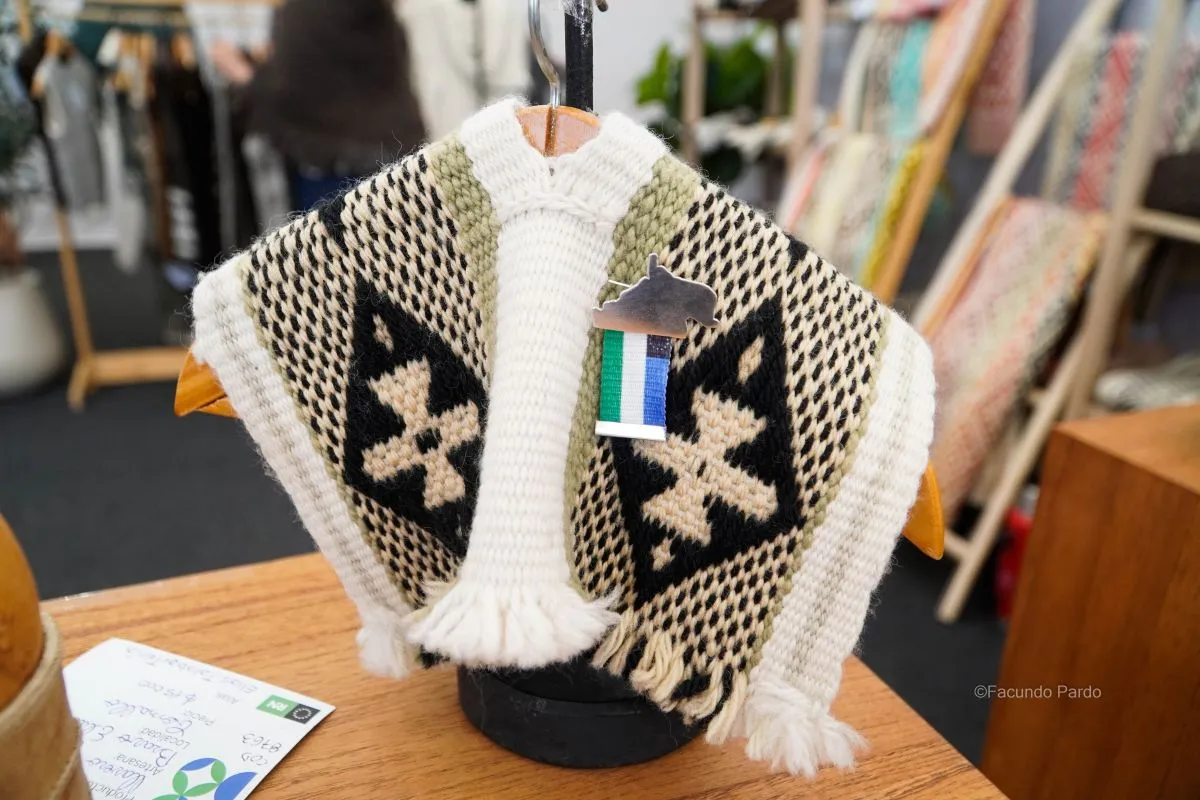 Está confeccionado con lana de oveja teñida con tintes naturales de la zona. El tejido se realiza en telar mapuche, una técnica ancestral transmitida por las tejedoras de la comunidad.