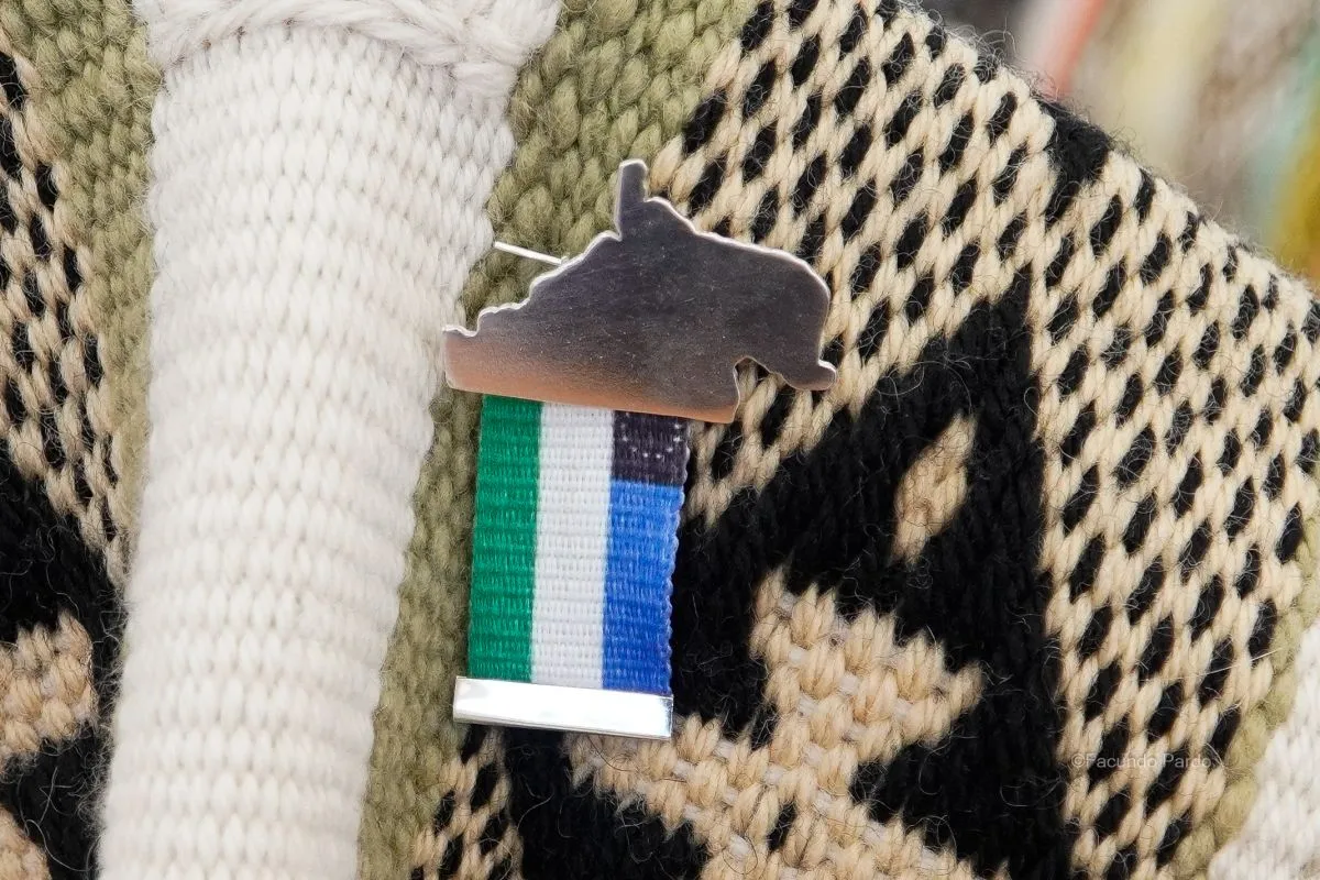 Ofrecen a la venta el pin con la bandera de Río Negro. Uno de estos pequeño accesorios decorativos fue dado como obsequio al gobernador Alberto Weretilneck cuando visitó el stand.