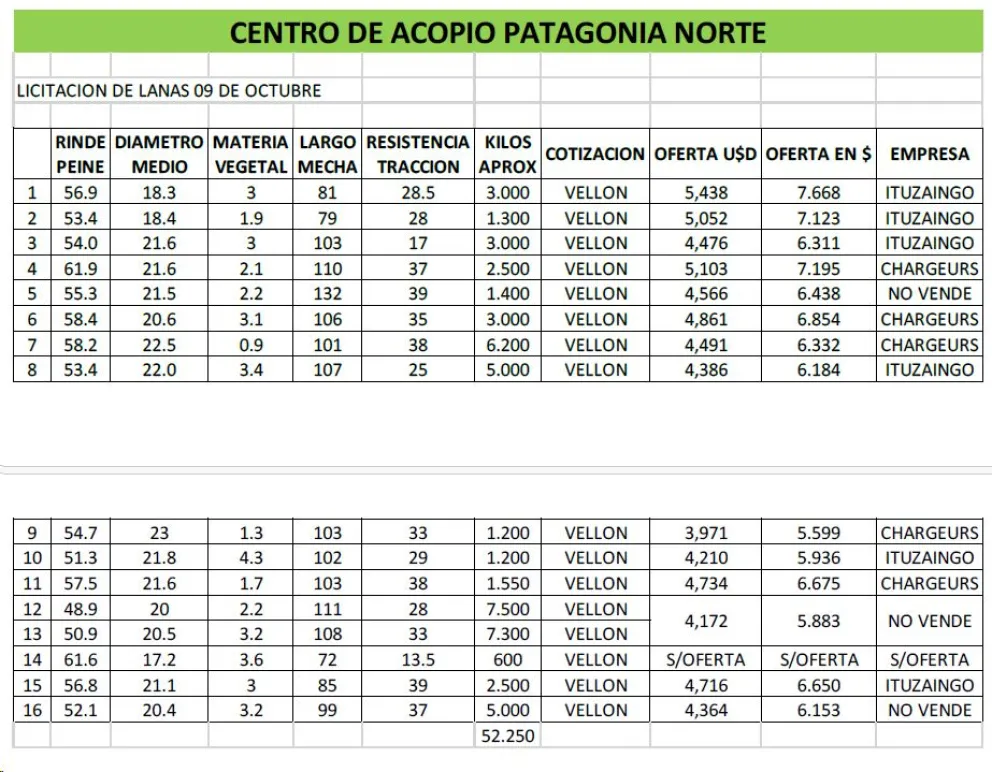 En esta oportunidad, participaron representantes de 4 firmas compradoras, Lempriere, Ituzaingó, Fuhrmann y Chargeus Wool.  La cotización más alta, fue de U$D 5,438 por kg de vellón, para un lote N°1, perteneciente al establecimiento “Alejandrito”, de la localidad de Stroeder. Este lote de 3.000 kg, de 18,3 micras de diámetro medio; 56,9% rinde al peine, 3% de materia vegetal, 81 mm de largo de mecha y 28,5 N/Ktex de resistencia, fue adquirido por la firma ITUZAINGO SA.