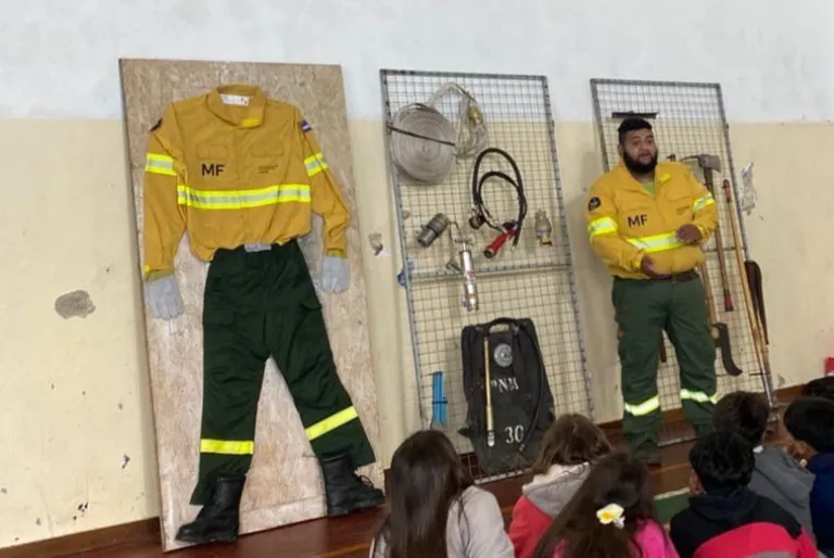Jenifer explica que las reuniones con los estudiantes se realizan en espacios amplios (incluso estuvieron en el Puerto San Carlos), con escuelas cercanas, para que concurran estudiantes de diversas instituciones educativas. “Se buscan gimnasios grandes, a los cuales los chicos puedan acceder caminando, lo que resulta mejor que ir escuela por escuela, ya que, de esa manera, conseguimos que varias juntas se sumen a la capacitación y las charlas”, apunta, detallando que “el plan educativo de quinto grado incluye la temática del trabajo sobre incendios forestales”.