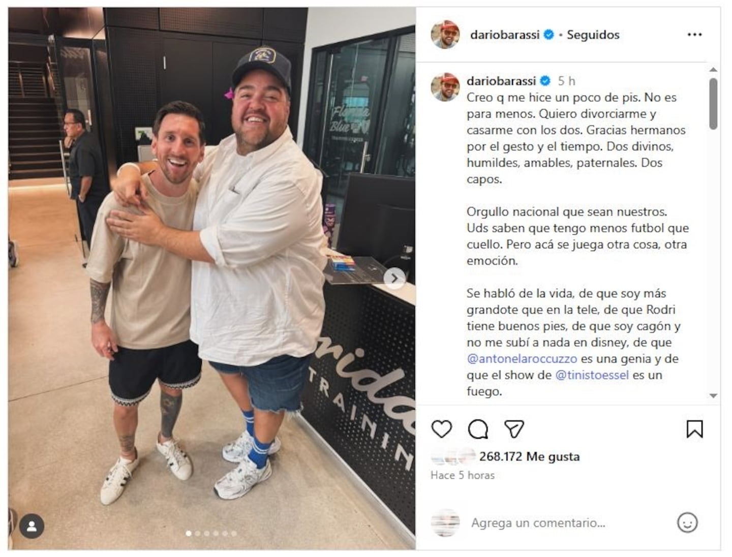 En una de las fotos que compartió, se lo ve abrazado al capitán de la Selección Argentina, con una sonrisa que habla por sí sola. Y fiel a su estilo, acompañó la imagen con una frase desopilante: “Creo que me hice un poco de pis. No es para menos. Quiero divorciarme y casarme con los dos”. La publicación, en cuestión de minutos, se llenó de comentarios y corazones.