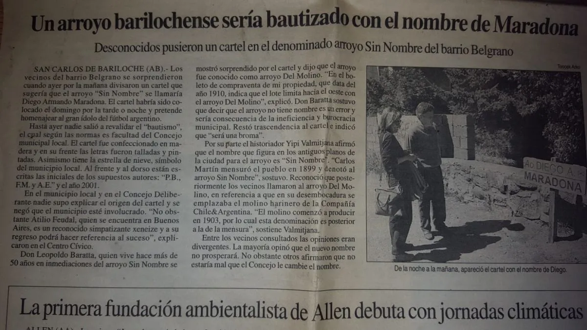 En los diarios de la ciudad fue noticia la iniciativa de tres fanáticos de bautizar un arroyo con el nombre Diego Armando Maradona.