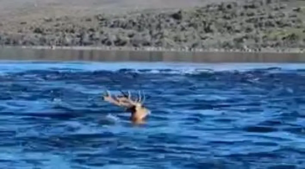 El domingo por la tarde, un vecino que pescaba en la desembocadura del Limay registró el momento en que un imponente ciervo avanzaba a nado entre las frías aguas patagónicas.