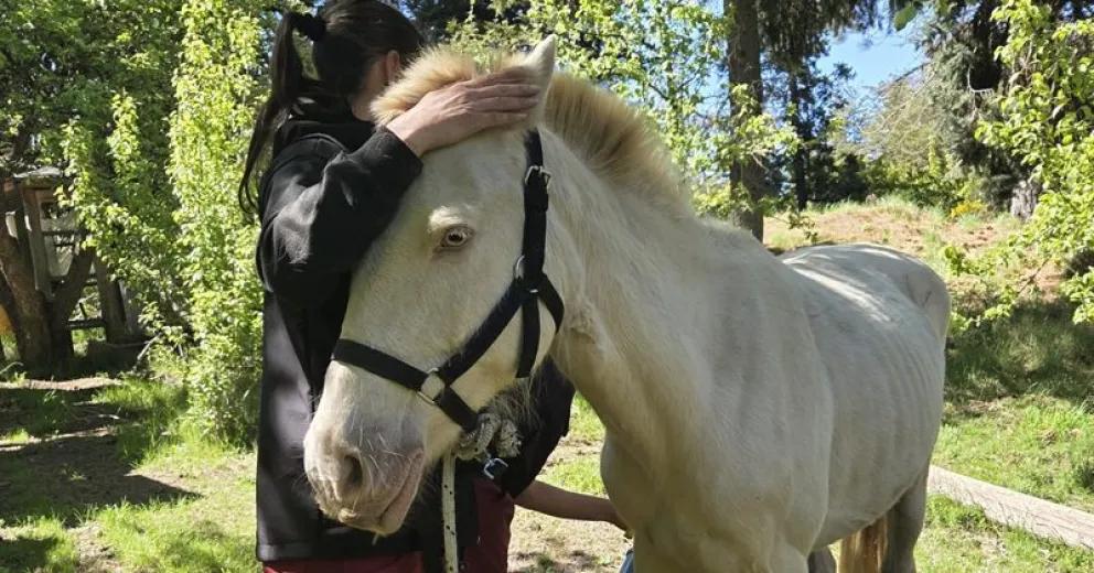 Rescatada en grave estado en la zona de Circunvalación, la yegua Nieve atraviesa la etapa final de su recuperación gracias al trabajo sostenido del equipo de Sanidad Animal de la Municipalidad de Bariloche.
