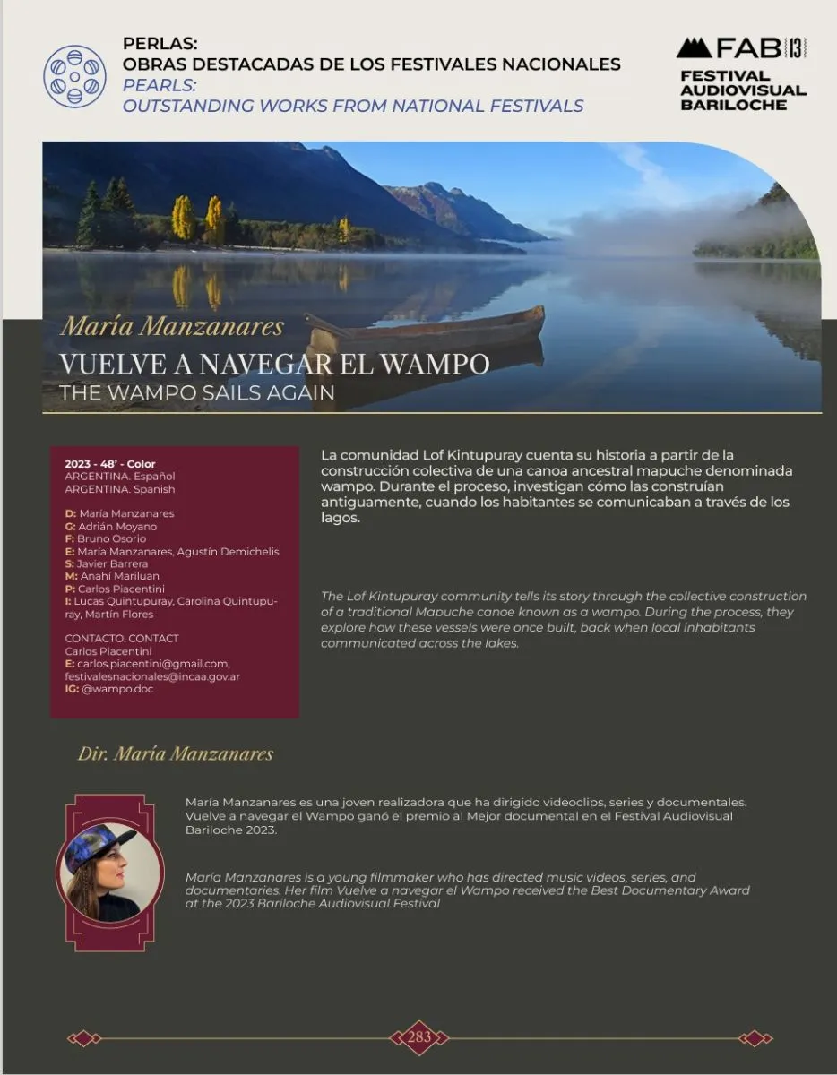 Oriunda de Bariloche, el Festival Internacional de Mar del Plata presenta a nuestra vecina como “una joven realizadora que ha dirigido videoclips, series y documentales. Vuelve a navegar el wampo ganó el premio al Mejor documental en el Festival Audiovisual Bariloche 2023”, señala la síntesis. En rigor, se trató de la Competencia Binacional de Largometrajes Argentina-Chile. Fue el segundo largo con su firma, el primero fue “Mankewenüy – Amiga del Cóndor”.