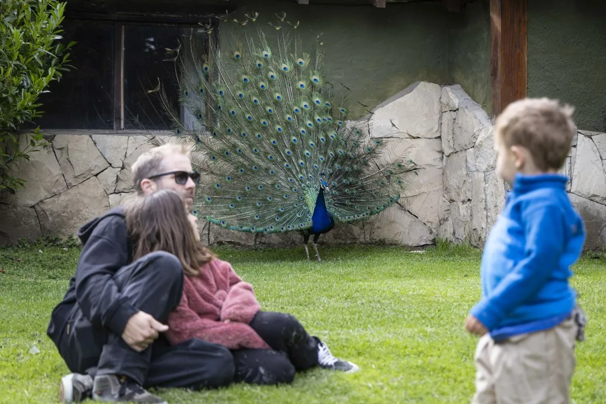 Detrás, como parte del paisaje, un pavo real en su esplendor.