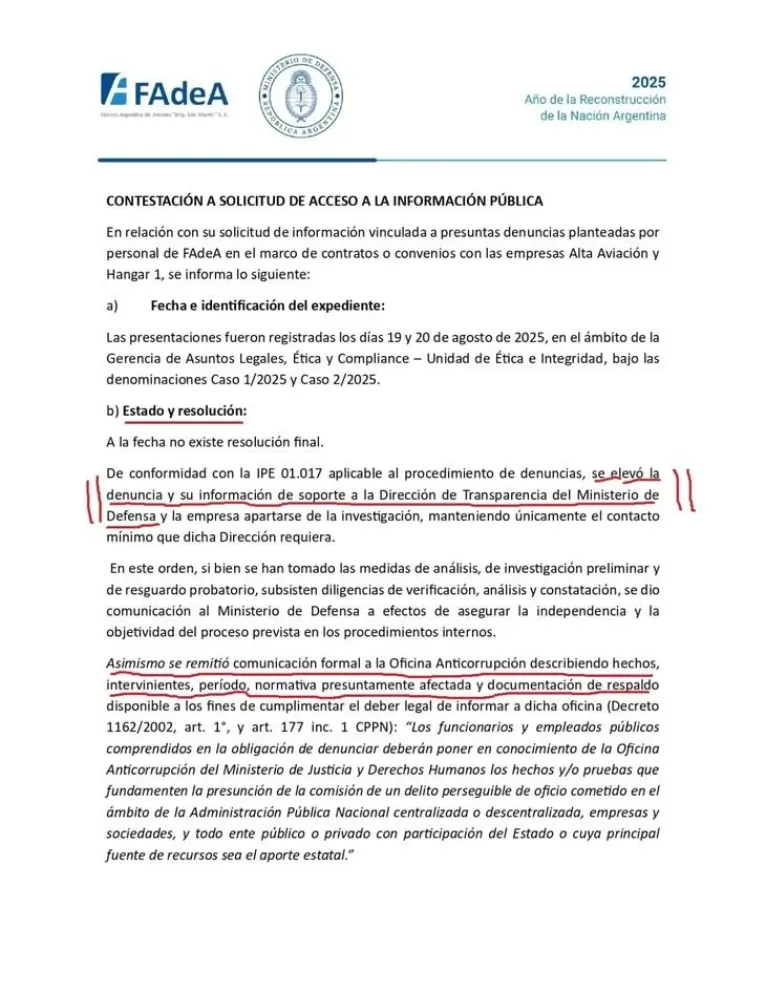 La Fábrica Argentina de Aviones (FAdeA), uno de los emblemas de la industria aeronáutica nacional, se encuentra en el centrode observación mediático y judicial debido a sospechas de corrupción. denuncias nternas de esta entidad estatal apuntan a la posible existencia de maniobras irregulares. El foco se sitúa en los acuerdos firmados con las empresas Hangar Uno y Alta Aviación.