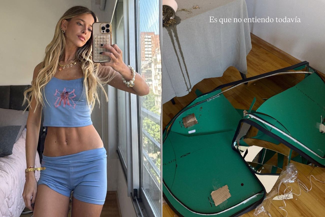 Las imágenes dejaban en evidencia la magnitud del golpe: cortes visibles en las muñecas, un tajo en la pierna, restos de vidrio desparramados por todo el piso y el marco del espejo totalmente destruido. “Por suerte, no me pasó nada grave”, aclaró la influencer para llevar calma a quienes seguían la secuencia desde Instagram.