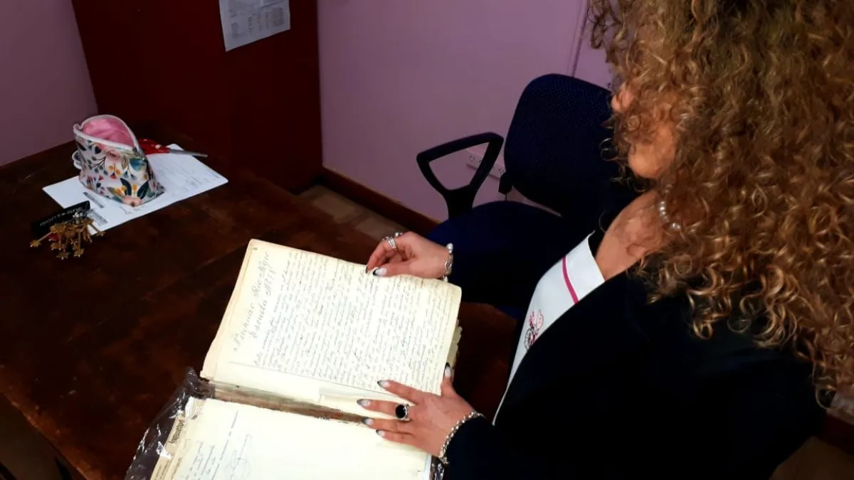 María Inés, con el libro histórico de la escuela.