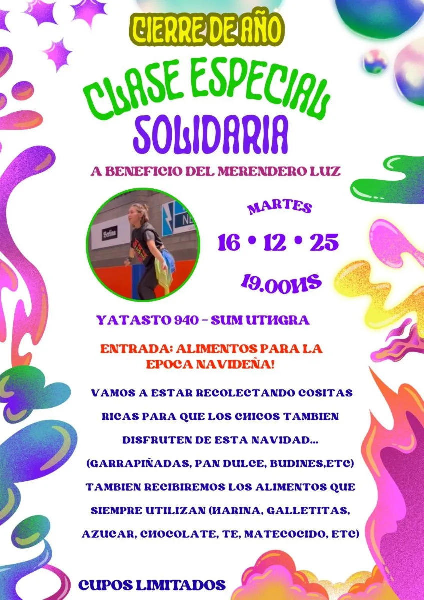 Se acerca el fin de año y no hay mejor manera de despedir el 2025 que bailando por una causa solidaria. Con la Navidad a la vuelta de la esquina, llega una clase especial de cierre de año con un objetivo noble: brindar ayuda al merendero Pan de Paz, que atraviesa un momento de necesidad. La propuesta estará a cargo de la instructora Mia Gallardo, quien invita a toda la comunidad "zumbatera" a sumarse.