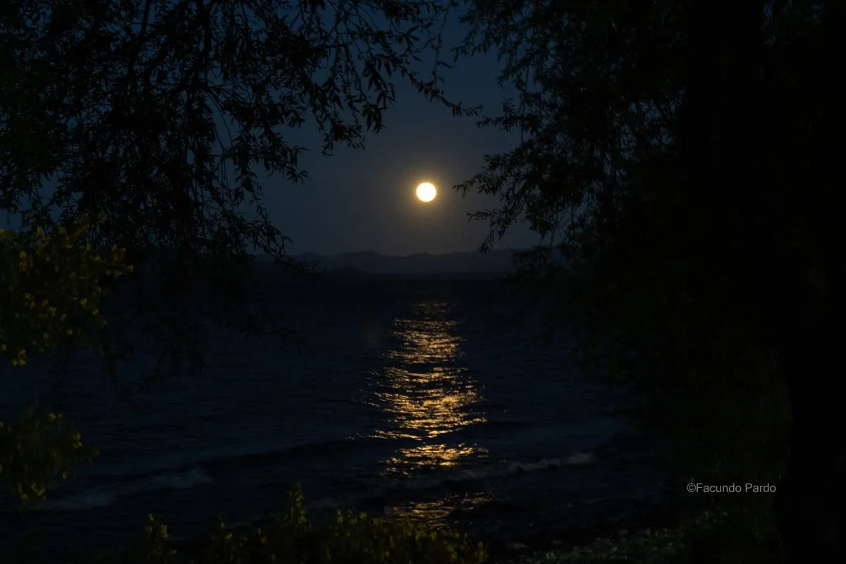Quienes estuvieron atentos desde temprano pudieron ver el momento en que la Luna salió por detrás de la cordillera, más grande y más brillante de lo habitual. Otros la descubrieron más tarde, ya suspendida sobre el Nahuel Huapi, dominando la escena nocturna.