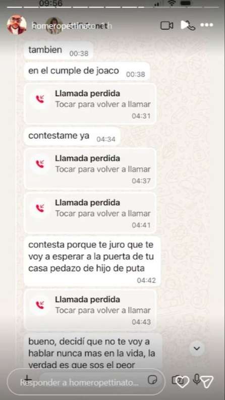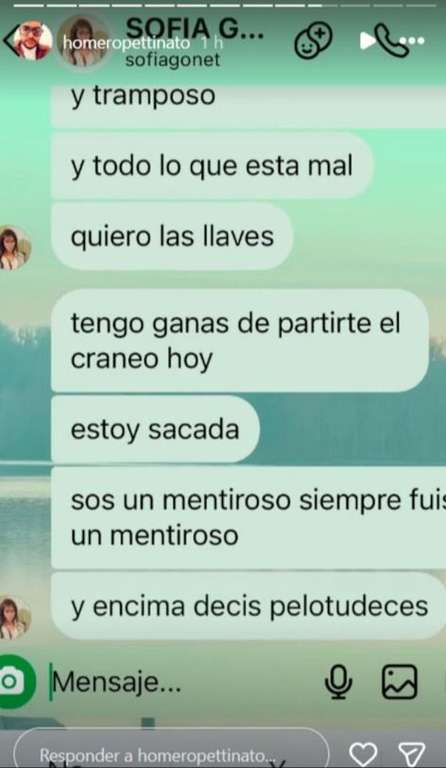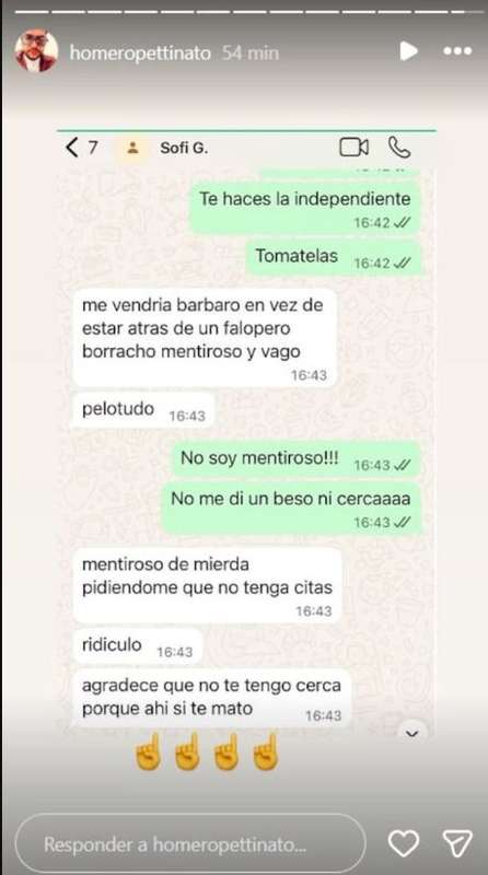 Entre los chats difundidos aparecen frases de extrema gravedad, escritas por Sofía Gonet, que Homero Pettinato decidió no ocultar. “Tengo ganas de partirte el cráneo hoy”, “Agradecé que no te tengo cerca, porque ahí sí te mato”, “Contestá porque te juro que te voy a esperar a la puerta de tu casa, pedazo de hijo de p....” y “Si algún día me entero que me cagaste voy a mandar todo el trabajo (por estar juntos) a la mierda y te voy a asesinar dde la peor de las maneras” fueron algunos de los mensajes que expuso, generando una reacción inmediata entre colegas y seguidores.